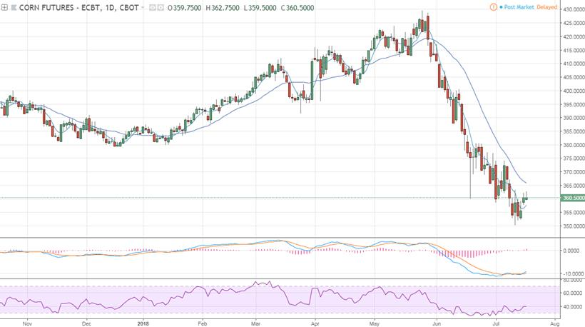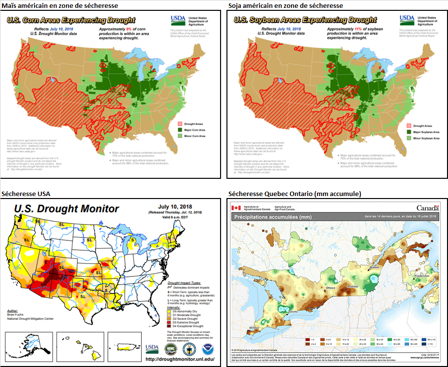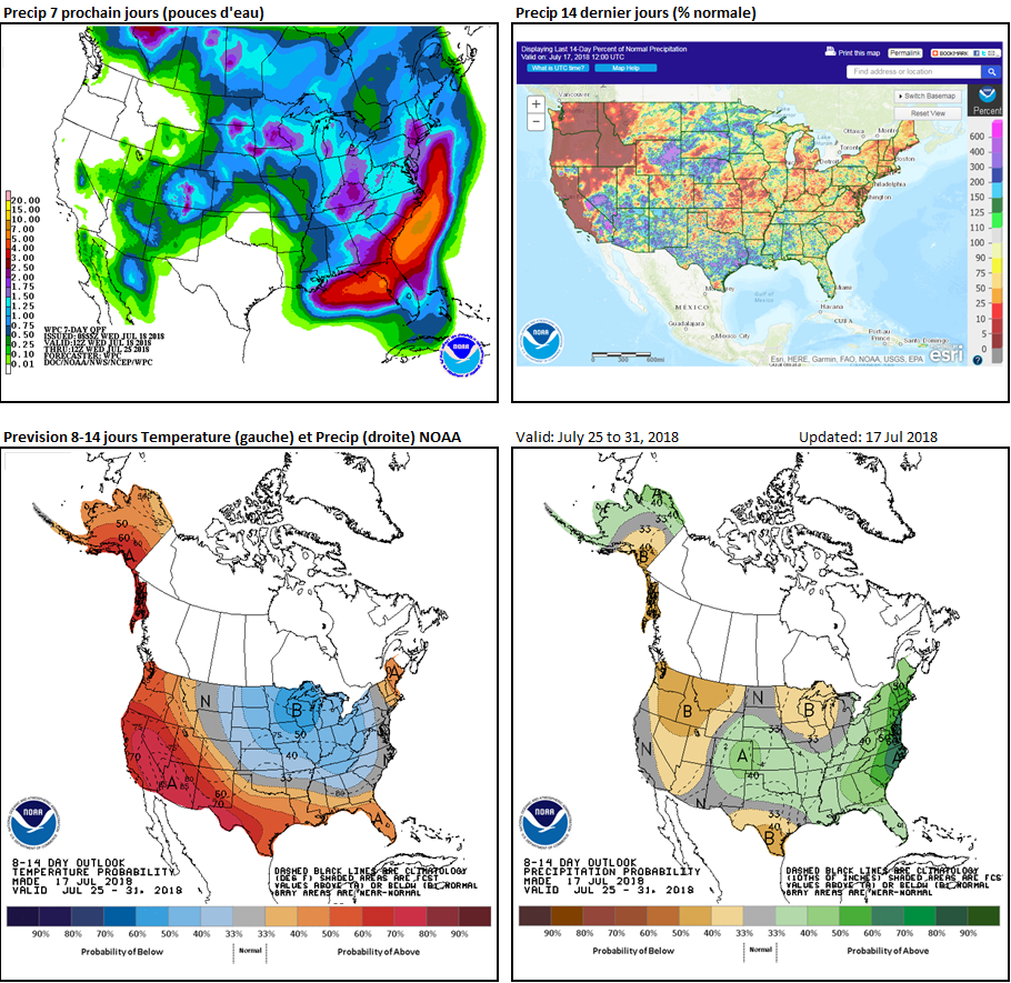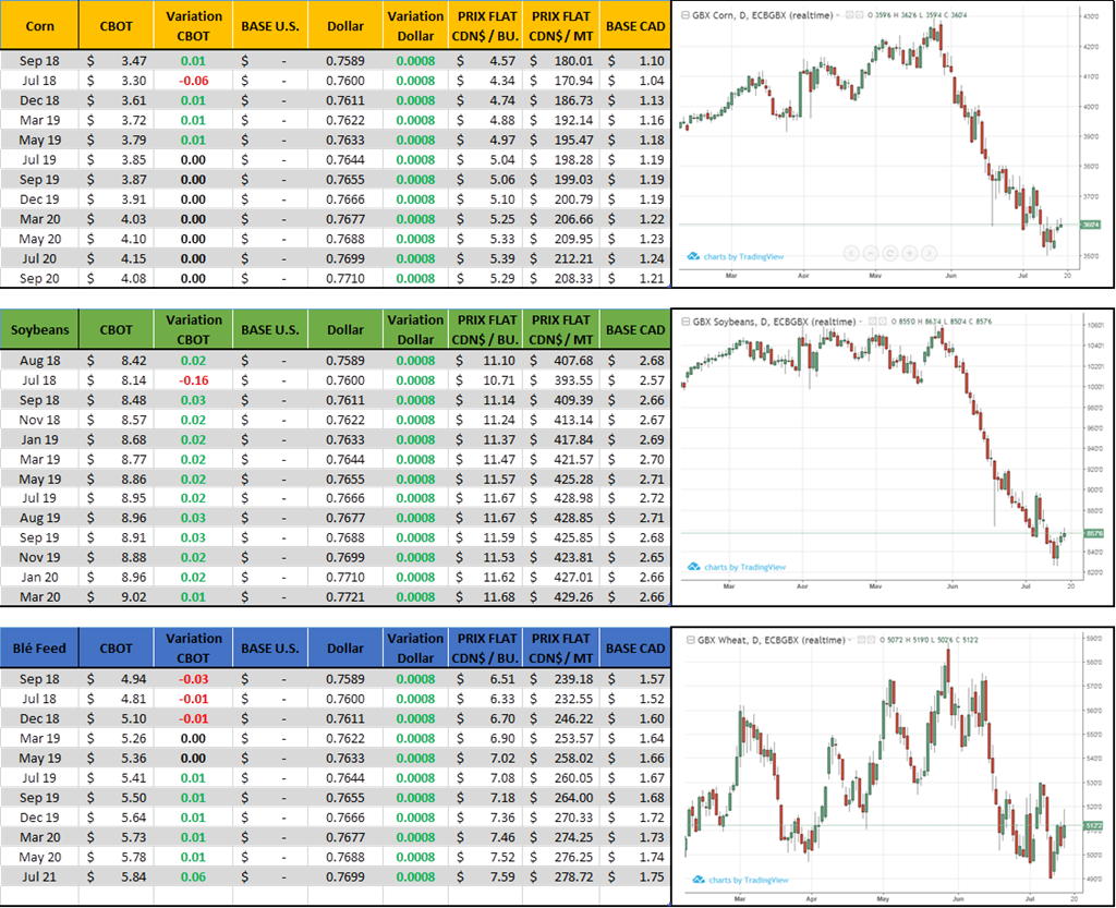 3. Analyse graphique. Depuis quelques jours on voit des signaux d’achat s’en venir. Par exemple dans le maïs-récolte les indicateurs MACD et RSI virent en mode achat. C’est intéressant de voir un mouvement technique du genre dans un contexte où les nouvelles bullish sont rares; les récoltes vont bien (malgré certaines rumeurs) la météo n’est pas mauvaise et les conflits commerciaux ne sont pas réglés. J’interprète cela comme étant une possibilité qu’aux yeux du marché les éléments négatifs pour les prix sont assez bien inclus dans le prix actuels et qu’il n’est pas nécessaire (pour le moment) d’aller creuser les prix d’avantage. Cela va en prendre plus, quelque chose comme 10 cents de hausse afin de mieux voir un renversement de tendance.