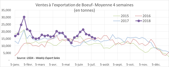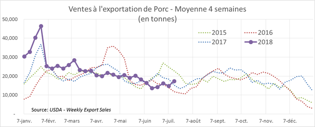 L’USDA estimait que les abattages étaient de 121 000 têtes hier, amenant le total de la semaine à 476 000 têtes. Il s’agit d’une hausse de +4.2% versus 2017. Hier, les ventes à l’exportation américaines publiées pour la semaine du 12 juillet étaient en baisse, à 13 518 tonnes, comparativement à 16 074 tonnes pour la moyenne des 4 dernières semaines. Il s’agissait tout de même d’un niveau supérieur aux 4 dernières années.