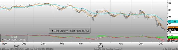 Aujourd’hui, le porc terminait en baisse pour l’ensemble des échéances. Techniquement, le contrat à terme d’août continue d’être sur une tendance baissière depuis le 9 juillet dernier. Le CàT d’août a clôturé à 65.45¢/lb, en baisse de -0.80¢/lb. Les échéances d’octobre et décembres perdaient près d’un sous la livre, à 51.28¢/lb et 45.93¢/lb respectivement.