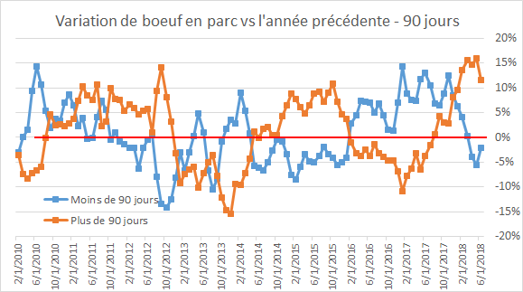 Le rapport Cattle on Feed publié aujourd’hui par l’USDA n’apporte pas grand surprise. L’USDA publiait des placements légèrement supérieurs aux estimés, à +1.3% versus 2017, comparativement à +0.9% attendu par les analystes ce qui légèrement négatif pour le marché. Les mises en marchés étaient en ligne avec les attentes, en hausse de +0.9% versus juin l’an dernier. Mise ensemble, les inventaires en parc étaient en hausse de +4.3% par rapport à juin 2017, pour un total de 11.28 millions de têtes en parc au 1er juillet 2018. La hausse est en majorité expliquée par la hausse du nombre de bêtes en parc depuis plus de 90 jours, ce qui pèse sur l’offre à court terme.