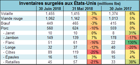 Selon le dernier rapport sur les inventaires surgelés, il y avait 560 millions lbs de porc au 30 juin ce qui est exactement comme l’an dernier. Les inventaires de flanc sont particulièrement élevés comparativement à l’an dernier (+130% versus 2017), mais il s’agit d’une comparaison favorisée par des inventaires anormalement faibles l’an dernier. Il n’est pas surprenant de voir les inventaires diminuer au même niveau que l’an dernier puisque les acheteurs chinois et mexicains ont possiblement acheté beaucoup de volume avant l’application des tarifs douaniers au début juillet. Ce qui sera particulièrement intéressant sera de constater l’impact des tarifs douaniers lors du prochain rapport dans 1 mois.