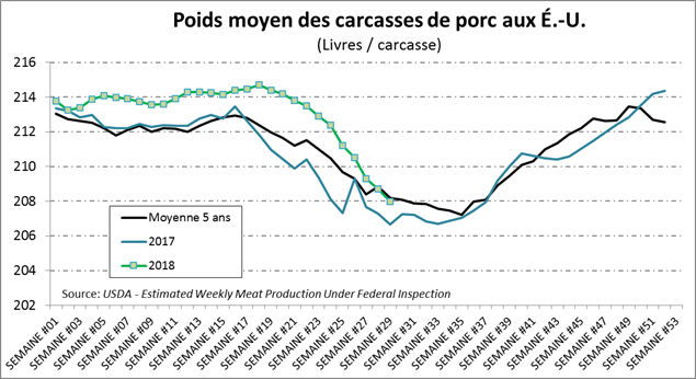 Vendredi dernier, l’USDA estimait que les abattages pour la semaine dernière étaient de 2.382 millions de têtes, en hausse forte hausse de +8.1 % par rapport à l’an dernier. Certaines sources citaient une augmentation de la production au cours de la fin de semaine en prévision de fermetures prévues cette semaine. La hausse de la production des dernières semaines, qui tourne autour de 4%, est tout de même un élément qui pèse sur les prix à court terme. Le poids des carcasses, à 208 livres, demeure +0.6% plus élevé que l’an dernier, ce qui contribue également à la hausse de l’offre. Mise ensemble, la production de la semaine dernière était en hausse de +8.8% comparativement à 2017.