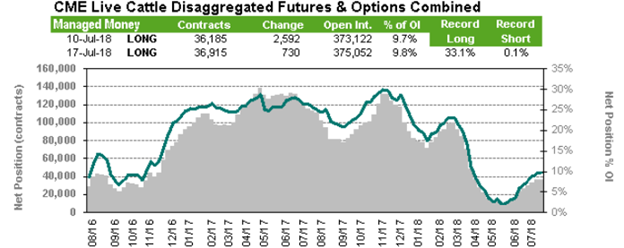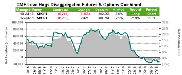 Vendredi, le rapport des positions publié par le CFTC montrait que les spéculateurs étaient vendeurs net de 6 291 contrats en date du 17 juillet. Les spéculateurs sortaient de leur position courte avec une diminution (achat) de 2 427 contrats sur la semaine. Historiquement, les spéculateurs sont acheteurs de contrat dans le porc. Leurs positions reflètent donc un pessimisme sur le marché alors que les mauvaises nouvelles s’accumulent.