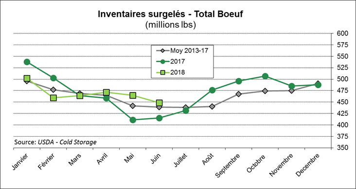 Au 30 juin, les inventaires surgelés de bœuf étaient de 448.6 millions lbs ce qui est légèrement au-dessus de la moyenne quinquennale, mais 8.0% de plus que l’an dernier. Depuis le début de l’année, il n’y a pas beaucoup de surpris dans les inventaires surgelés de bœuf qui oscillent autour de la moyenne historique. Concernant le total des viandes rouges, il y avait 1.06 milliard lbs dans les congélateurs ce qui est 4.9% de plus que l’an dernier mais 1.0% de plus que la moyenne 5 ans. Autrement dit, la moitié du surplus qu’on avait au mois de mai a disparu.