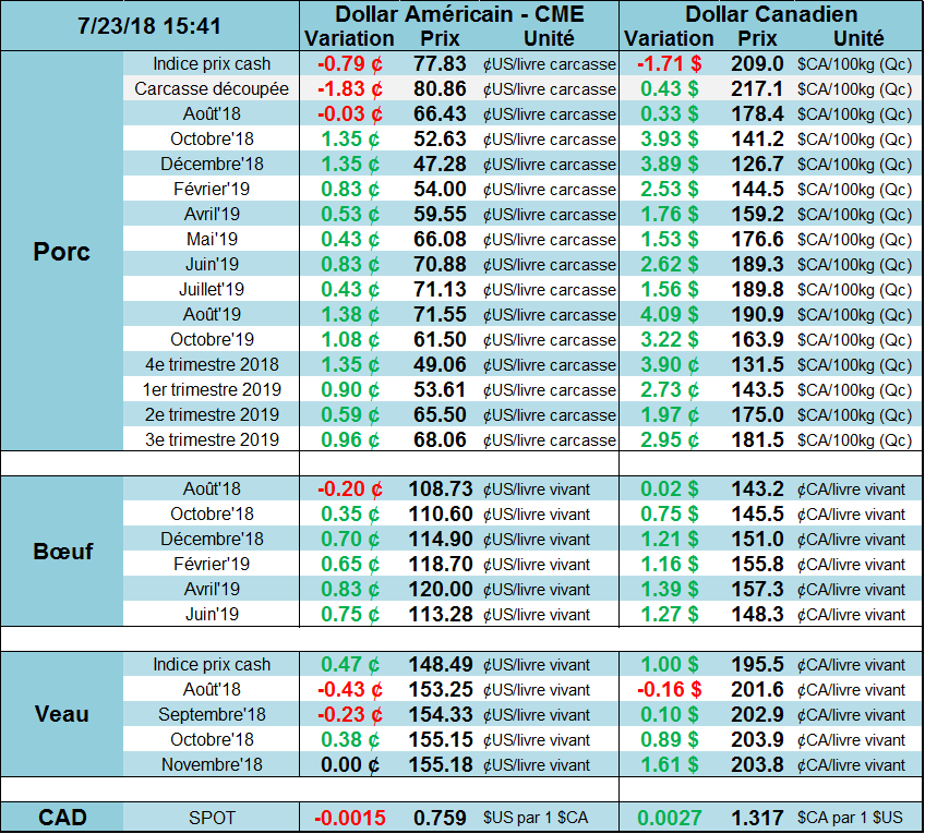 Aujourd’hui, le porc d’août terminait à 66.43¢/lb, pratiquement inchangé par rapport à sa fermeture de 66.45¢/lb vendredi. Les échéances d’octobre, décembre et février rebondissait de +1.18¢/lb, +1.30¢/lb et +0.80¢/lb respectivement, annulant la chute de vendredi. Les deux principaux éléments qui continuent de peser sur les marchés sont la forte progression de la production de porc et les craintes quant à l’avenir du marché d’exportation américain qui permet d’écouler un peu plus de 20% de la production américaine de porc. Au moins, le prix des découpes rebondissait ce matin (+1.64 @ 82.50) ce qui a permis au marché de rebondir après la publication vendredi de la plus faible valeur depuis la mi-juin.