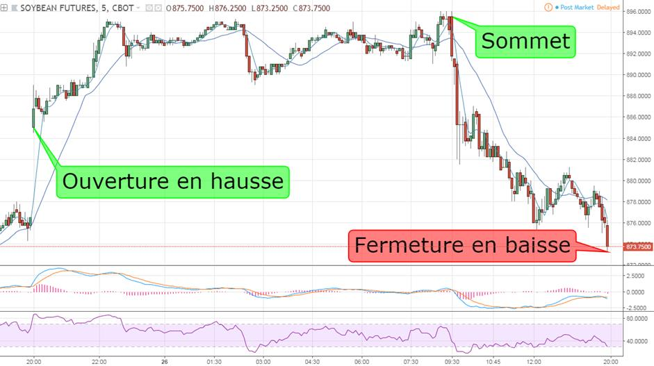 Graphiquement la journée d’aujourd’hui pourrait mettre une douche d’eau froide au mouvement haussier des deux dernières semaines. Après avoir été en nette hausse aujourd’hui, les cours du blé, du maïs et de la fève soja ont tous fléchis en fin de séance. Dur à dire s’il s’agit seulement d’une pause et d’une consolidation du rebond ou un signe d’une baisse qui s’en vient. Je ne m’avance pas trop à ce sujet. Par contre avec mon expérience sur les marchés je me méfie toujours des journées ou on fait un nouveau haut (ou bas) pour clôturer la journée en sens inverse.
