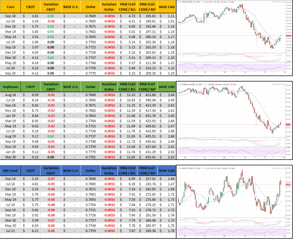 Une des raisons que les marchés ont été en hausse aujourd’hui, surtout dans le cas des fèves c’est la nouvelle concernant l’Europe qui voudrait acheter plus de soja américain. Naturellement une meilleure demande signifie qu’on rajuste l’équilibre de prix à la hausse. Par contre si le marché pense que la perte d’exportation en Chine à cause des tarifs sera compensé par plus d’export en Europe il ne faut pas rêver en couleur… La Chine via des agences et sociétés gouvernementales achètent pour 32 millions de tonnes de soja aux USA, c’est très loin devant le 4 millions de tonnes de l’Union Européenne. Aussi, le fait que le prix US est nettement moins cher à cause des tarifs et puisque l’acheteur européen sont privé (libre marché) je pense plutôt qu’ils flairent la bonne affaire de s’approvisionner en stock US compte tenu de l’énorme discount sur les prix mondiaux.
