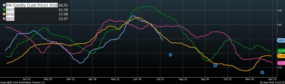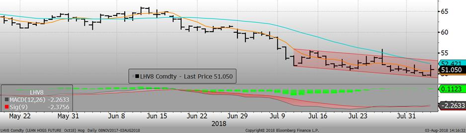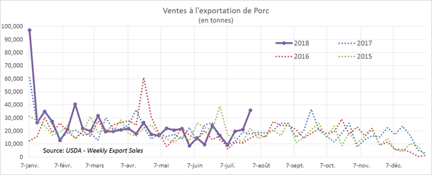 Hier, l’USDA publiait de bonnes ventes à l’exportation, à 16,159 tonnes. Il s’agit davantage d’un rebond, car les ventes publiées la semaine précédente était au plus bas volume hebdomadaire de l’année, à seulement 4,738 tonnes. Depuis le début de l’année, les exportations nettes de bœufs ont aidé à supporter la demande du bœuf américain avec des ventes à l’export en hausse de +18.7% comparativement à 2017. Si cette situation perdure, les prix pourraient bien se maintenir malgré la hausse de production attendue au 3e trimestre.