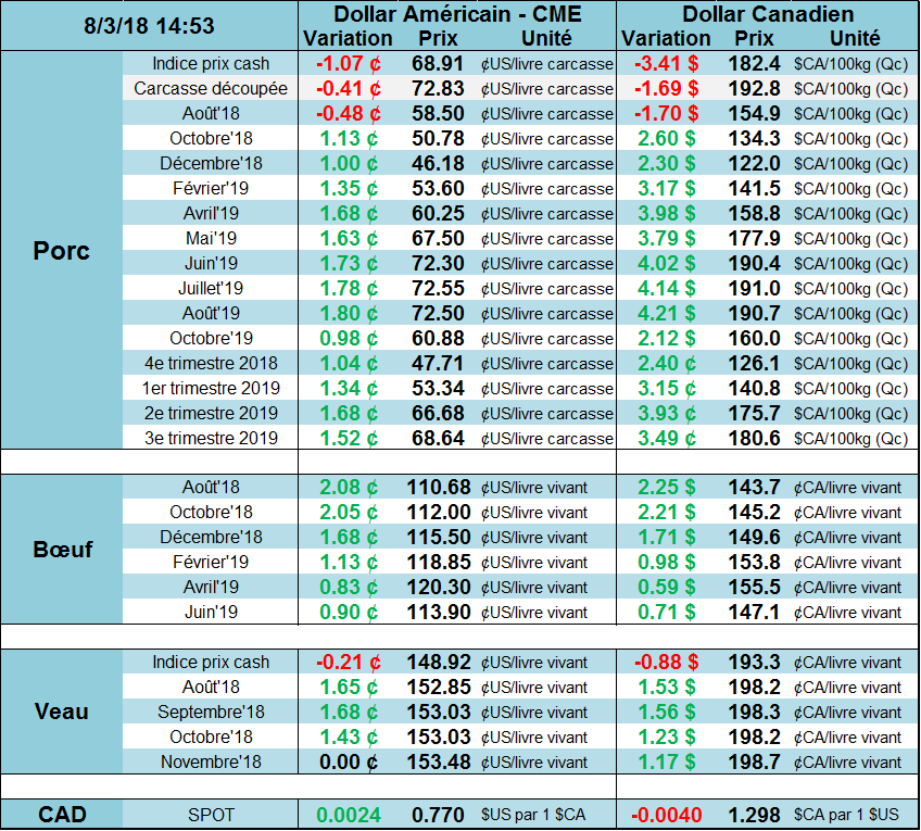 Aujourd’hui, les prix ont rebondi à l’exception de l’échéance d’août qui continu de refléter des anticipations faibles pour le prix cash dans 2 semaines, environ 30 $CA/100kg de moins pour 10 jours ouvrables.