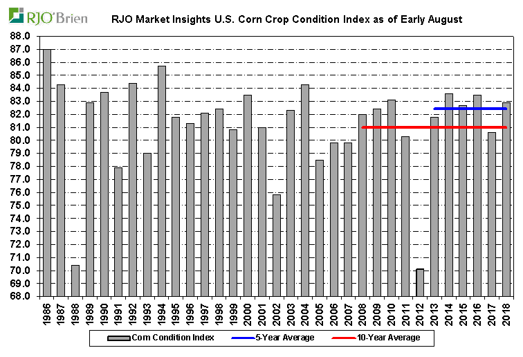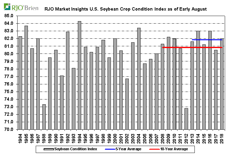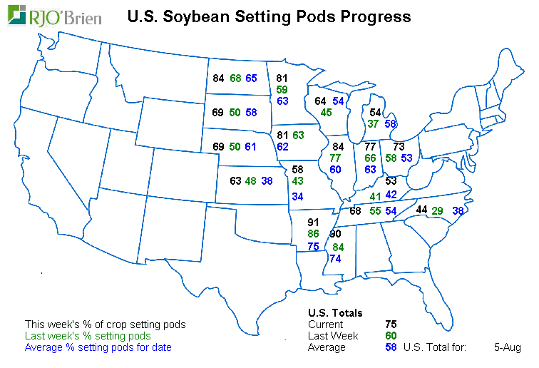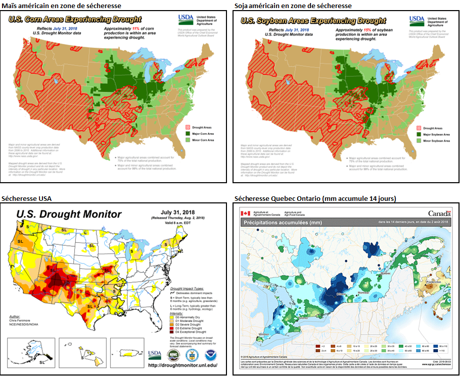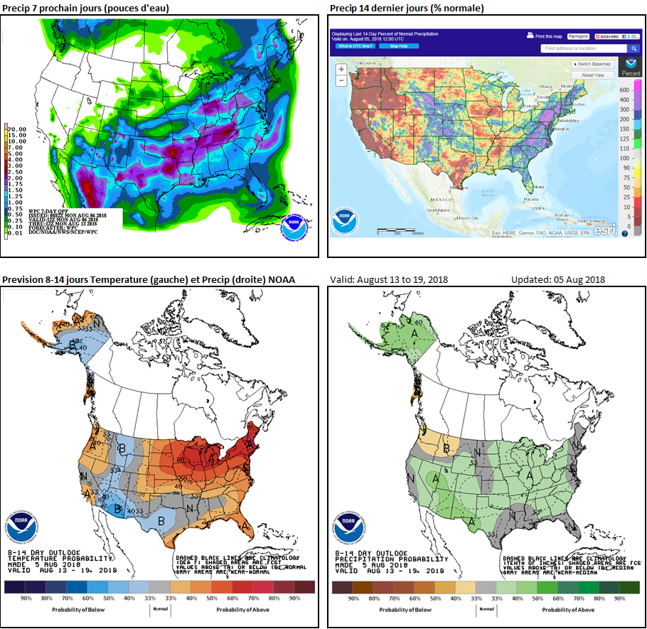 Coté météo on voit quelque endroits où il faudrait de l’eau possiblement d’autre secteur qui ont connu des températures élevés pourrait avoir eu des problèmes au moment de la pollinisation. L’USDA jettera un premier coup d’œil au rendement dans son rapport vendredi midi. En ce moment les perspectives de rendement sont extrêmement bonnes encore, mais entre courtier nous nous disons qu’elles ont baissées légèrement depuis une semaine au deux. Les discussions autour de 180 et plus boisseaux à l’acre dans le maïs sont un peu plus rare et nous entendons plus de conversations et projections autour du 175-177 BPA. L’an passé a été un record à 176BPA donc comme je disais les rendements cette année sont toujours prévu pour être excellent, s’agit de savoir à quel point et aussi comment la saison va se terminer… est-ce que le mois d’aout sera décevant coté météo/pluie et aussi est-ce que septembre et l’automne s’étirera pour aller cherche un ou deux boisseaux à l’acre de plus/moins. Rajouter mon meilleur ami Donald dans le bouillon est la sauce pour changer de gout rapidement, qui sait.