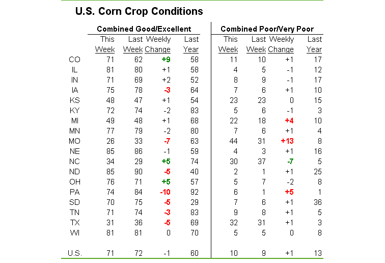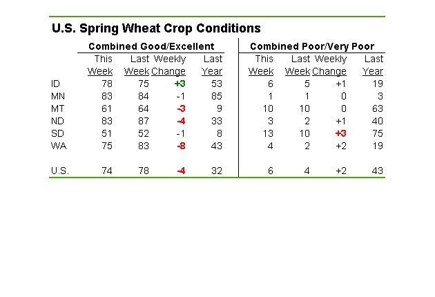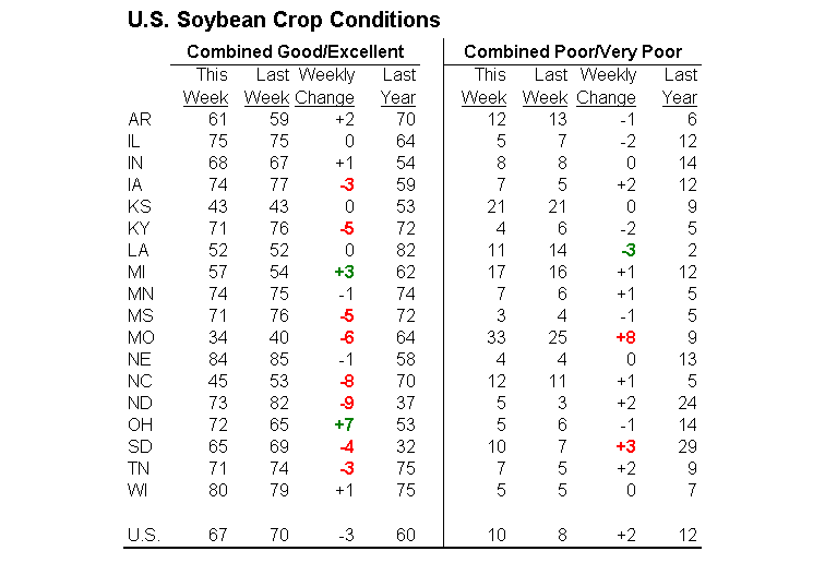 Les conditions des cultures ont reculées cette semaine, principalement coté soja et blé printemps ou le déclin a été plus important que les anticipations.