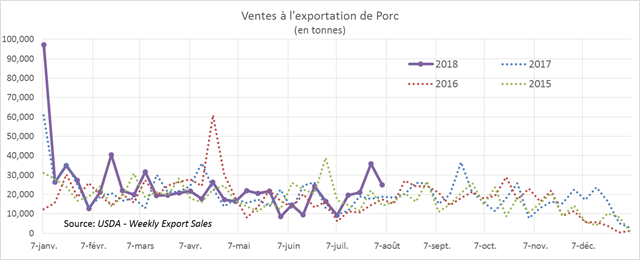 En plus du rebond technique, il semble que le marché soit encouragé par les rapprochements entre le Mexique et les États-Unis, le plus important acheteur (40% des exportations de porc). Si les tarifs de 20% en vigueur venait à être retirer, cela enlèverait de la pression sur les prix. Pour l’instant, ce sont les acheteurs étrangers autres que le Mexique et la Chine qui bénéficient grandement de la baisse des prix. Car pour eux, sans tarifs, le porc américain est soudainement devenu très bon marché. Hier, cela se reflétait pour une 2ème semaine par de très bonnes ventes à l’exportation. Selon l’USDA, les ventes à l’exportation pour la semaine du 2 août étaient de 24 871 tonnes. La semaine d’avant, celles-ci étaient de 35 744 tonnes. Les publications des 4 dernières semaines étaient toutes supérieurs aux dernières années (voir graphique).