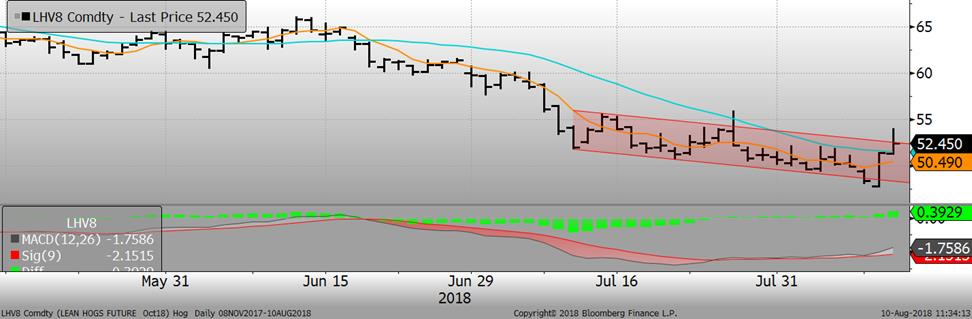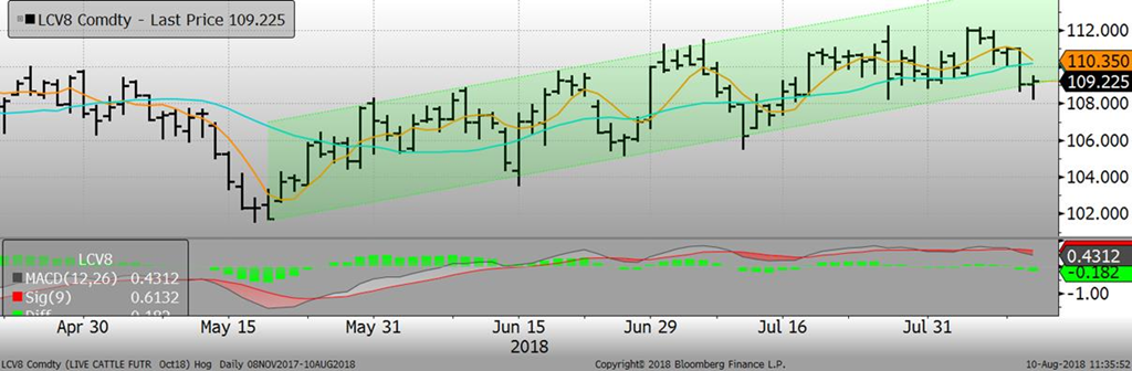 Jeudi, le bœuf terminait en baisse pour l’ensemble des échéances alors que le prix cash tournait autour de 110¢/lb au Nebraska. Le bœuf d’août (-1.57¢/lb) terminait à 108.25¢/lb, alors qu’octobre (-1.90¢/lb) et décembre (-1.50¢/lb) clôturaient à 109.05¢/lb et 112.98¢/lb respectivement. Le marché semble s’inquiété de la hausse des imports dû à la force du dollar et aux sécheresses en Australie qui pourraient pousser les éleveurs Australien à augmenter leur production à court terme.