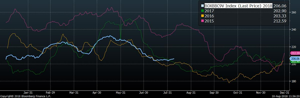 L’indice CME du prix cash de ce matin s’établissait à 61.88¢/lb, en baisse de -1.29¢/lb. L’indice du prix cash continue sa descente, perdant en moyenne -1.25¢/lb par jour lors des 10 dernières publications. Il semble que le marché anticipe une fin à cette glissade du prix cash, car le prix du contrat d’octobre est seulement 2¢/lb plus bas qu’août maintenant.