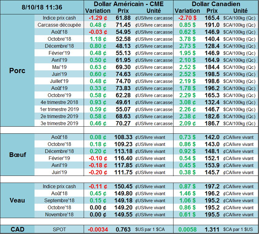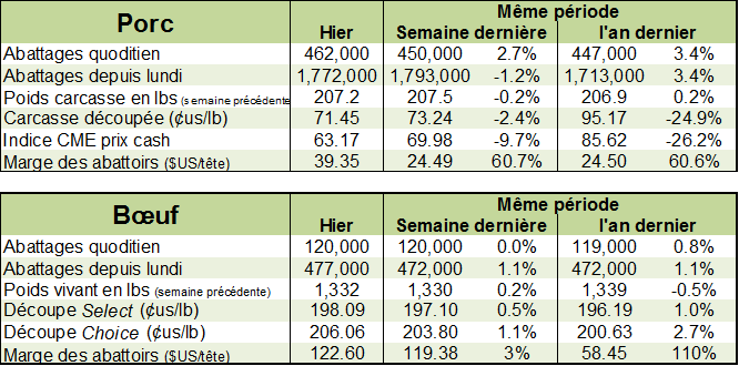 Selon l’USDA, les abattages étaient de 462 000 têtes hier ce qui amène le total pour la semaine à 1.772 million de têtes, soit une hausse de +2.7% comparativement à l’an dernier.
