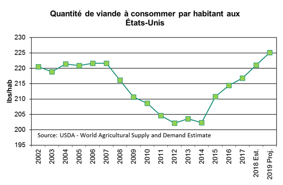 Pour la première moitié de l’an prochain, la croissance de l’offre de viande suivra la même tendance que cette année et proviendra principalement de la viande rouge, alors que la croissance de l’offre de volaille demeurera inférieure à +2%. La compétition dans le marché des protéines animales demeurera élevée l’an prochain avec une consommation prévue de 225 lbs/habitant (+4lbs par rapport à cette année). À cette quantité de viande, ce serait un record d’abondance de viande en sol américain. Cette offre de viande par habitant continue d’être menée par la volaille (111 lbs), suivie du bœuf (58.7 lbs) et du porc (53.9 lbs).