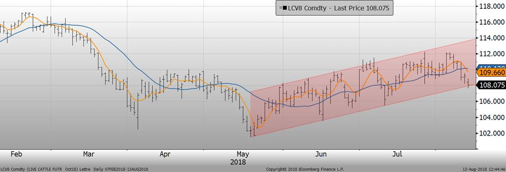 Vendredi dernier, le bœuf d’août clôturait inchangé, à 108.25¢/lb. Les échéances d’octobre et décembre gagnaient +0.20¢ et +0.12¢/lb, à 109.25¢ et 113.10¢/lb respectivement. Aujourd’hui, le bœuf ouvrait à la baisse de -1¢/lb pour l’ensemble des échéances.