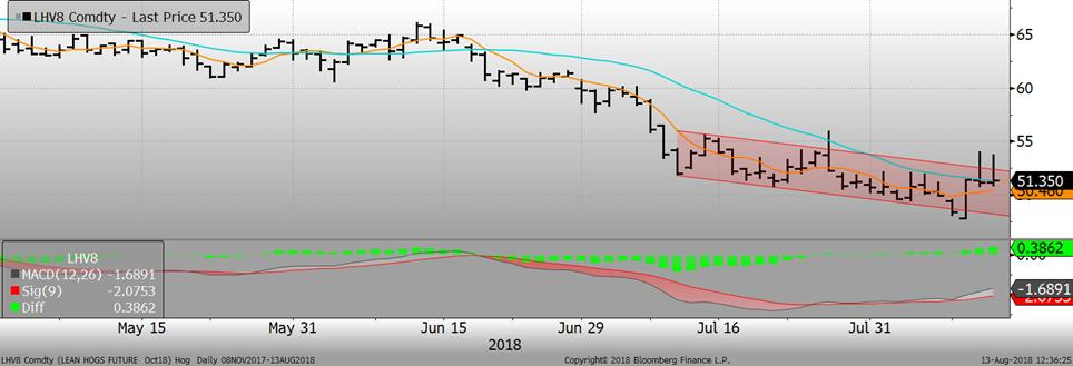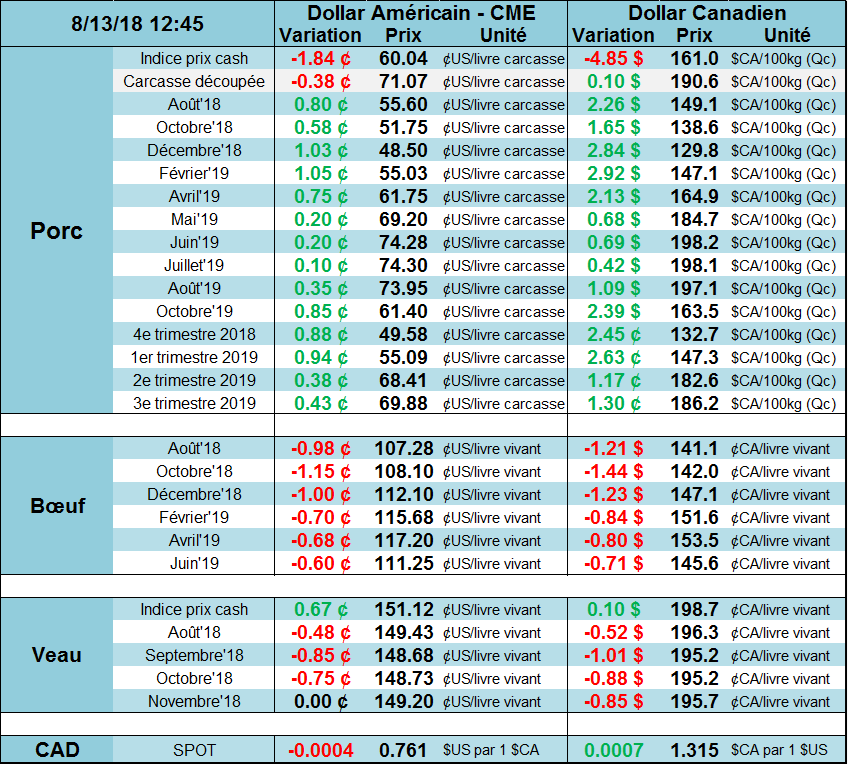 Aujourd’hui, le porc d’octobre rebondissait de près de +2¢/lb à l’ouverture après avoir clôturé sans direction vendredi, à 51.18¢/lb. Techniquement, si le porc continue son rebond, il va se frapper à de fortes résistances dans la zone des 54-55¢/lb. Après avoir touché des bas à 47.85¢/lb jeudi dernier, le rebond des derniers jours a permis au porc d’octobre de se transiger aux niveaux de la mi-juillet. Le porc d’août, dont l’expiration est demain, ouvrait également à la hausse de +0.80¢/lb signalant que le marché anticipe un ralentissement de la glissade du prix cash. L’indice CME du prix cash de vendredi était publié à aujourd’hui 58.28¢/lb alors que le porc d’août terminait la semaine à 54.80¢/lb.