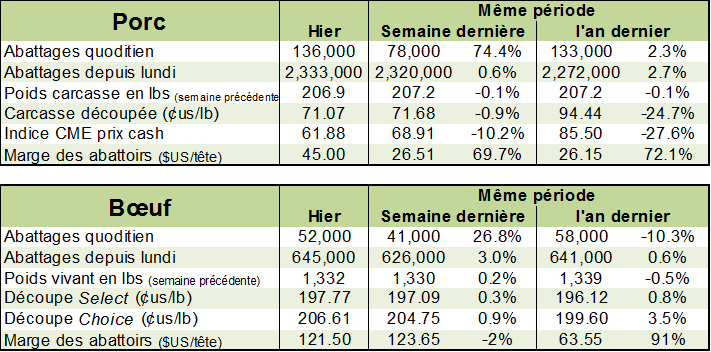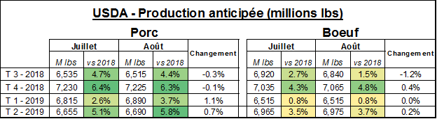 Vendredi dernier, l’USDA estimait que les abattages étaient de 645 000 têtes la semaine dernière, en hausse de 19 000 têtes par rapport à la semaine dernière. Comparativement à l’an dernier, il s’agissait d’une augmentation 9 000 têtes ou +1.4%. Il faudra que le rythme d’abattage s’accélère à partir de septembre pour rencontrer les projections de production de l’USDA pour le 4e trimestre.