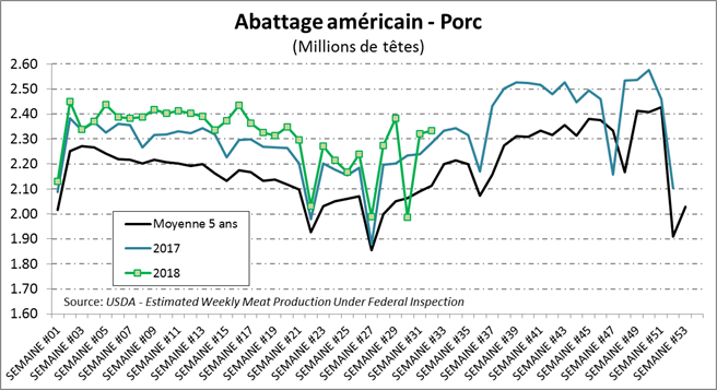 Vendredi, l’USDA publiait des abattages à 2.333 millions de têtes pour la semaine dernière. Le rythme d’abattage était en hausse de +2.1% par rapport à la même période l’an dernier. Le poids par bête a continué de glisser, à 206.9 lbs carcasse, passant sous les niveaux de l’an dernier pour la première fois cette année. Ce n’est pas tellement surprenant que le poids moyen diminue. Face à un prix anticipé si faible, les éleveurs ne sont pas incités à engraisser les bêtes davantage. Mis ensemble, la production de la semaine était en hausse de +2.0% comparativement à 2017.
