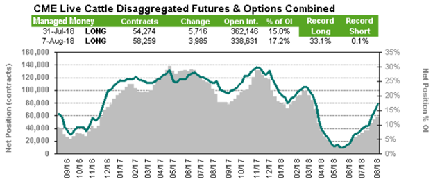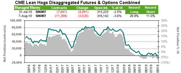 Vendredi, le rapport des positions publié par le CFTC montrait que les spéculateurs étaient vendeurs net de 11 369 contrats en date du 7 août, une augmentation (vente) de 3 528 contrats sur la semaine. La quantité de contrats ouverts est restée pratiquement inchangé sur la semaine.