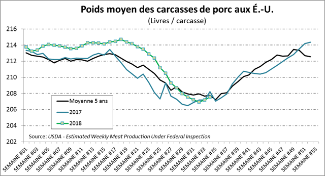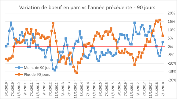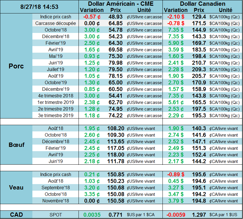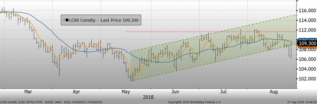 Le rapport Cattle-on-Feed publié vendredi dernier par l’USDA était assez positif pour le prix du bœuf. Au final, les analystes auront eu raison sur la hausse de la quantité de bœuf en parc, +4.6% par rapport à l’an dernier. Au total, il y avait 11.09 millions de têtes en parc au 1 août 2018. La nature de ces inventaires en parc a changée au cours des deux derniers mois avec des bêtes en moyenne moins lourdes. La hausse des bœufs de plus de 90 jours (+6.5% vs 2017) a considérablement ralentie comparativement aux 2 derniers mois (+16% au 1er juin). Également, les bœufs de moins de 90 jours (+2.8% vs 2017) étaient à la hausse. Autrement dit, l’ampleur de la commercialisation devrait ralentir au courant des prochains mois. À cela s’ajoute les placements de mois de juillet avec des bœufs de moins de 600 livres qui étaient en hausse de +14% par rapport à l’an dernier et ceux entre 600 et 700 livres étaient à la hausse de +23% versus 2017. Il s’agit d’un élément positif pour le contrat d’octobre et plus particulièrement décembre, car l’offre pourrait bien être plus limitée pendant une courte période alors que l’engraissement prendra un mois ou deux de plus.