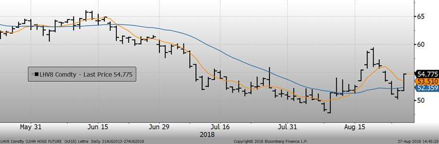 Vendredi, le porc d’octobre et décembre clôturaient à 51.78¢/lb et 51.23¢/lb respectivement. Le marché anticipe une hausse du prix cash au cours des prochaines semaines, car le premium entre le contrat d’octobre et le prix cash de vendredi tourne autour de +4.50 à 5.50¢/lb avec la nouvelle hausse d’aujourd’hui. La semaine dernière, c’est l’abondance de l’offre qui continuait de peser sur le cash à court terme qui est venue compenser les 3 cas de fièvre africaine en Chine. Selon l’USDA, les abattages étaient de 2.526 millions de têtes la semaine dernière, une augmentation de +3.1% comparativement à la semaine dernière. L’augmentation de la semaine dernière se comparait à 2.451 millions de têtes l’an dernier, soit une augmentation de +8% la semaine dernière versus la même période l’an dernier. Cette hausse de l’offre est probablement en cause dans l’absence de rebond du cash la semaine dernière. Le ralentissement naturel qui suivra cette hausse de l’abattage et le congé férié de la fête du travail devraient contribuer à stimuler le prix cash au cours des prochaines semaines.