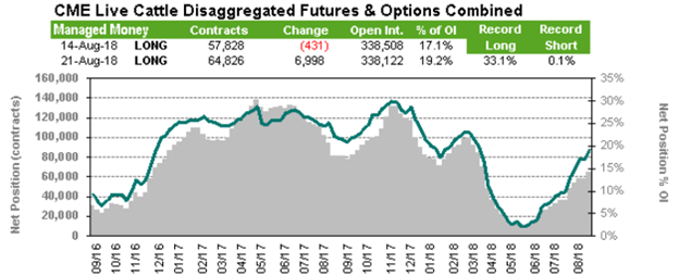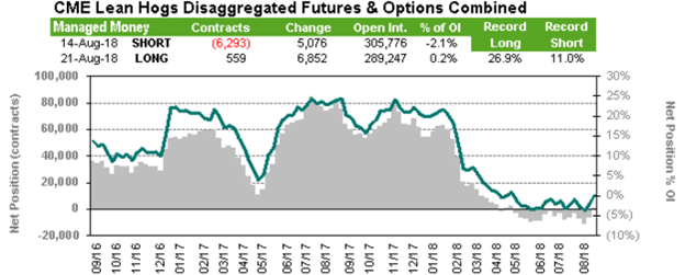 Vendredi, le rapport des positions publié par le CFTC montrait que les spéculateurs étaient de retour en position acheteurs, avec une petite position nette de 559 contrats en date du 21 août, une augmentation (achat) de 6293 contrats sur la semaine. Le fait que la quantité de contrats ouverts (open interest) diminuait de 16 529 pointait dans la direction d’une couverture de positions courtes par les spéculateurs qui ne veulent pas être pris par un mouvement haussier. Historiquement, les spéculateurs détiennent une position longue dans le porc et la situation actuelle démontrait l’ampleur du pessimisme dans le marché du porc. Leur retour sur le marché pourrait facilement ajouter 50 000 contrats d’achat dans les prochaines semaines.
