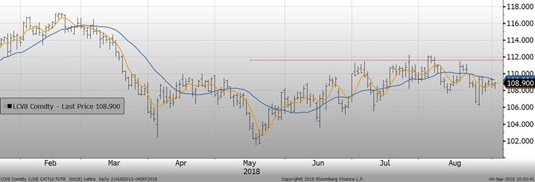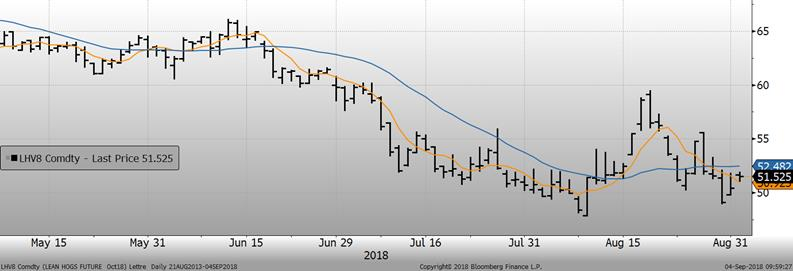 Le porc d’octobre a clôturé en hausse de +1.30¢/lb vendredi, à 50.43¢/lb. À ces prix, le porc d’octobre se négociait près de +4.50¢/lb au-dessus du prix cash. Plus le rebond du prix cash se fait attendre, moins il reste de temps pour le prix cash fasse son rebond tant attendu. Vendredi, le marché était optimiste sur les échéances plus lointaines, décembre gagnaient +0.77¢/lb, à 53.40¢/lb et février prenait +0.30¢/lb, à 62.88¢/lb.