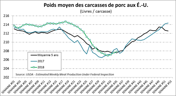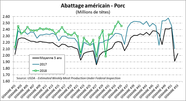 La semaine dernière, l’USDA estimait que les abattages étaient de 2.455 millions de têtes, en hausse de +5.7% par rapport à l’an dernier. Il s’agit d’une baisse de 63 000 têtes comparativement à la semaine précédente où un record de production pour l’année avait été atteint. Le poids par bête continue de se maintenir aux niveaux des dernières années, à 207.8 lbs carcasse, pour une production aussi en hausse de +5.3% comparativement à 2017, à 510.2 million de livres. À court terme, l’abondance de l’offre continue de peser sur le prix cash, permettant aux abattoirs de dégager une marge brute de 54 $US/tête.