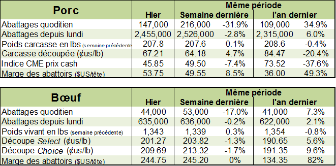 Vendredi, l’USDA estimait que les abattages étaient de 635 000 têtes la semaine dernière, pratiquement le même niveau que la semaine précédente (636 000 têtes). Il s’agissait d’une hausse de +1.9% par rapport la même période l’an dernier. Avec un poids par bête légèrement plus bas que l’an dernier, la production était en hausse de +1.3% versus 2017. Depuis le début de l’année, la production de bœuf est en hausse de +3.1% comparativement à l’an dernier.