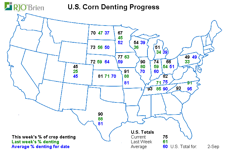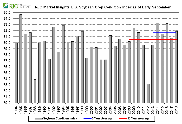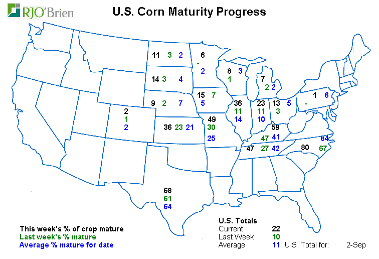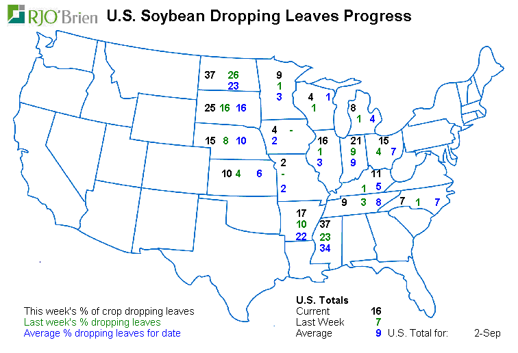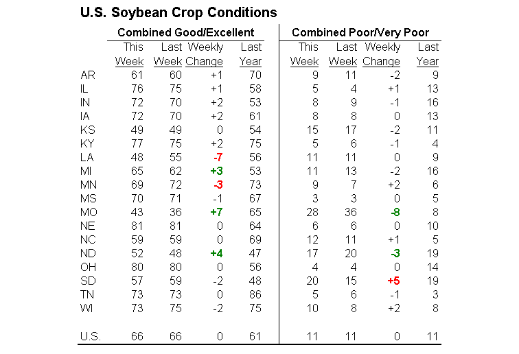 -Condition de la culture de soya US : 66% good/excellent vs 66% attendu (fourchette de 65-67%), 66% semaine dernière, 61% l’an dernier