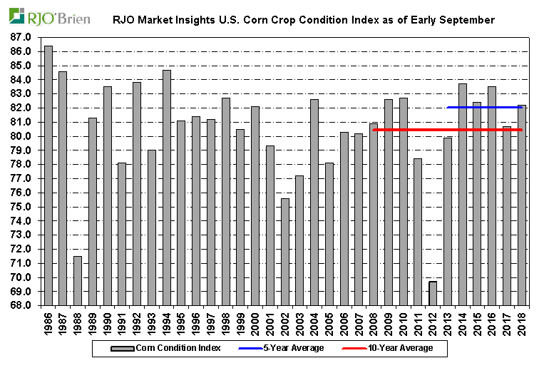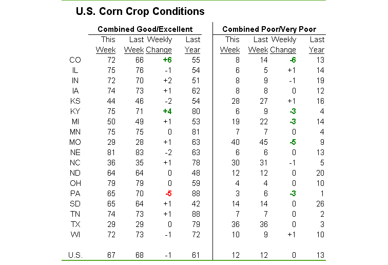 -Condition de la culture de maïs US: 67% good/excellent vs 68% attendu (fourchette de 66-69%), 68% semaine dernière, 61% l’an dernier