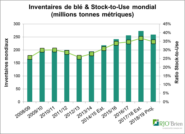 Tout ça mis ensemble, ça regarde bien pour le maïs, dont les inventaires devraient diminuer aux États-Unis si la demande continue de bien se porter. Essayons deux scénarios possibles : à 178.4 boisseaux à l’acre, les inventaires de fin seront à 1.68 milliards de boisseaux, comparativement à 2.03 milliards de boisseaux en 2017. Même si on est conservateur et que l’on estime un rendement à 180 boisseaux à l’acre (bande rouge), on finirait l’année avec des inventaires à 1.82 milliards de boisseaux. Tout de même en baisse importante! Cela laissera peu de marge de manœuvre pour la récolte 2019…
