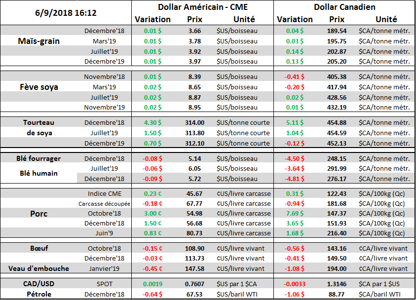 Les dernières prévisions des analystes pour le rendement dans le maïs sont en ligne ou légèrement supérieur aux estimés de l’USDA, à 178.4 boisseaux par acre. La bonne nouvelle, c’est que les analystes semblent dire que s’il y a une révision, elle ne sera pas importante. Au même moment, la demande continue de tourner rondement aux États-Unis, mais aussi dans le reste du monde, ce qui a été confirmé par les derniers chiffres d’utilisation de juillet et la force des exportations américaines qui se chiffraient à 266.4 millions de boisseaux, une hausse de +79.1 millions de boisseaux ou +42.2% par rapport à l’an dernier. Même signal du côté des ventes à l’exportation pour le mois d’août qui demeurent historiquement élevées.