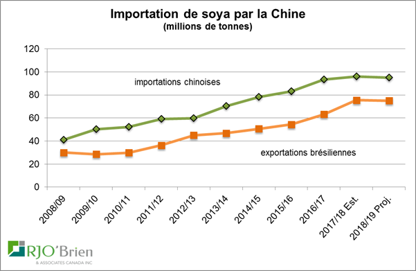 Bon, il semblerait bien que la Chine va devoir continuer d’acheter des américains. Le Réal brésilien a beau atteindre des creux historiques, il y a une quantité limité de fèves à vendre et les chinois en consomment beaucoup, pas mal plus que le Brésil peut fournir cette année. Ça commence à se faire sentir dans les prix à l’exportation sortant du Brésil dont les primes ont augmenté dans les derniers mois. Mais pour l’an prochain? Ça, c’est une autre histoire. Même au niveau actuel, le prix du soya est attirant pour les agriculteurs brésiliens parce que le prix est en dollar américain et que le Réal s’est considérablement déprécié. Et ça va probablement encourager les agriculteurs à augmenter les acérages pour la prochaine récolte au Brésil ce qui devrait laisser le marché en abondance jusqu’à l’été prochain.