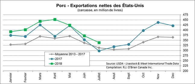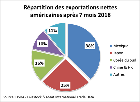 Jeudi, l’USDA publiait les exportations nettes de porc à 338.8 millions de livres pour le mois de juillet, en hausse de +13.7% comparativement à juillet 2017 ce qui est largement supérieur à la moyenne de progression des 12 derniers mois (+6.3%). En juillet, les exportations ont atteint 425.1 millions de lbs, principalement vers le Mexique (127 M lbs), le Japon (99 M lbs) et la Corée du Sud (41 M lbs). Les volumes achetés par la Chine et Hong-Kong étaient de 28 M lbs, il s’agissait d’un nouveau bas. Depuis le début de l’année, la part des exportations allant au Mexique et en Chine était en baisse de -2% par rapport à 2017 pour chacune des destinations. C’est la Corée du Sud, avec un bond de 12% à 16% des volumes américains qui a compensé.