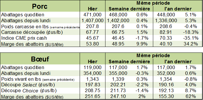 Jeudi, les estimés d’abattages de l’USDA étaient de 471 000 têtes. Cela porte le total pour le début de la semaine à 1.41 million de têtes, en baisse par rapport à la semaine dernière due à la journée fériée de lundi. Comparativement à l’année dernière, il s’agit tout de même d’une hausse de +3.9% ou 53 000 têtes.