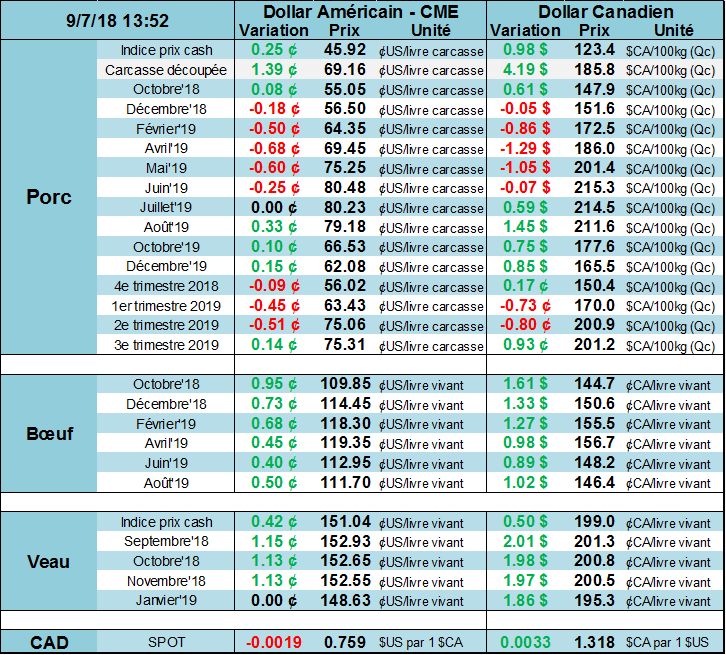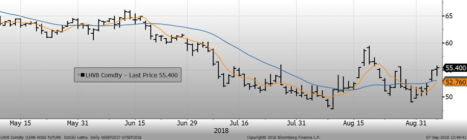 Hier, le porc d’octobre finissait limit up (+3¢/lb), à 54.98¢/lb. Il semble que le marché anticipe une accélération du cash qui a timidement commencé à tourner positif. Avec le porc d’octobre qui se transige au-dessus du prix cash, le prix devra continuer sa hausse d’ici la mi-octobre pour que les anticipations du marché se réalisent. En 5 semaines (d’ici l’échéance du contrat d’octobre), le prix peut facilement rebondir d’une dizaine de cents la livre (moyenne de +0.4¢/lb), ce serait un rebond similaire à ce qu’on avait vu en octobre 2017. Les échéances de décembre (+1.50¢/lb), février (+0.67¢/lb) et avril (+0.42¢/lb) faisaient également des gains hier, lesquelles sont plutôt inchangées cet après-midi. L’indice CME du prix cash pour la journée d’hier sera publié à 46.01¢/lb, en hausse de +0.09¢/lb par rapport à la veille et de +0.57¢/lb pour les 3 dernières publications.