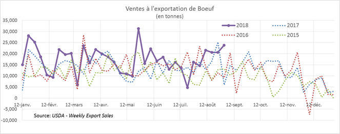 Selon l’USDA, les ventes à l’exportation pour la semaine du 30 août étaient de 19 162 tonnes, en baisse de -9904 tonnes par rapport à la semaine dernière. C’est la première semaine que les ventes sont en dessous du niveau des dernières années, après presque 2 mois durant lesquels les ventes à l’exportation américaines ont été supérieures aux dernières années (voir graphique)!