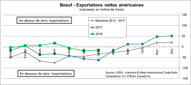 Hier, l’USDA publiait des exportations nettes de bœuf à -16.0 millions de livres pour le mois de juillet continuant de se maintenir au-dessus du niveau des années précédentes. Les exportations américaines du mois de juillet sont sorties à 279.2 millions de livres, une progression de 7 millions de livres par rapport à juin. Au même moment, les importations ont progressées de 4.1 millions de livres, à 295.3 millions de livres.