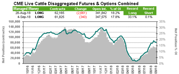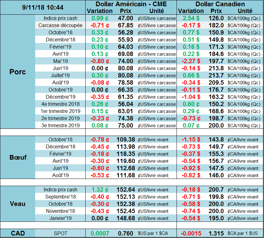 Selon l’USDA, les abattages étaient de 2.215 millions de têtes la semaine dernière, une forte baisse de 9.8% comparativement à la semaine dernière alors que l’abattage était réduit par le congé férié de la fête du travail. Les abattages de la semaine dernière se comparaient à 2.198 millions de têtes l’an dernier, soit une légère augmentation de +0.8% la semaine dernière versus 2017. La forte baisse des abattages la semaine dernière et un poids moyen inférieur aux niveaux de l’an dernier ont diminué l’offre à court terme ce qui a probablement aider à stimuler le cash à amorcer sa remontée la semaine dernière.