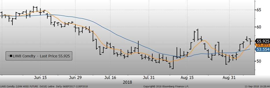 À court terme, la bonne nouvelle, c’est que le cash a enfin tourné positif la semaine dernière. L’indice CME du prix cash pour la journée de vendredi sera publié à 47.00¢/lb ce matin, en hausse de +0.99¢/lb. Il s’agissait d’une hausse cumulée de +1.56¢/lb lors des 4 dernières publications. Hier, le porc d’octobre et décembre clôturaient à 55.95¢/lb et 55.70¢/lb respectivement. Le porc d’octobre qui se transige à un premium de +8-9¢/lb par rapport au cash, c’est dire que le marché anticipe une telle hausse du prix cash au cours des prochaines semaines d’ici l’échéance du 12 octobre. Néanmoins, la hausse du prix cash pourrait ralentir si l’ouragan Florence prend de la vigueur et frappe la Caroline du Nord et la Virginie, affectant les activités d’abattage de Smithfield Food. N’oublions pas que le plant à Tar Heel de Smithfield abat environ 7 à 8% de la production américaine (32,000 porcs/jour).