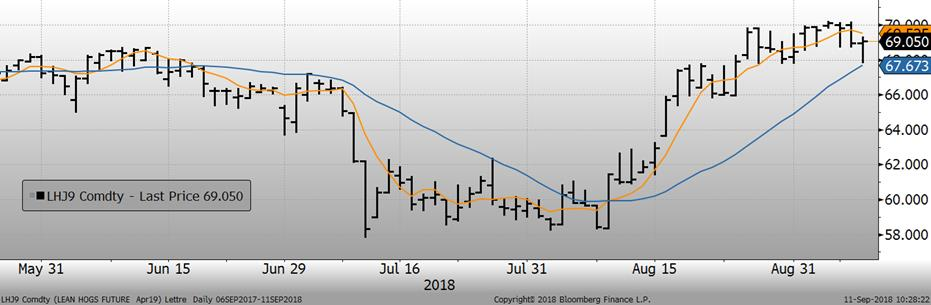 La semaine dernière, l’apparition de nouveaux cas de peste porcine africaine et la remontée du prix cash donnaient du gaz à la tendance haussière, mais il demeure que ça va en prendre plus pour que la hausse sur les échéances de 2019 se maintienne. Même si le potentiel haussier dû à une maladie est important à moyen et long terme, il demeure qu’à court terme l’offre est abondante et le cash demeure historiquement bas. Selon, l’Organisation Mondiale de la Santé Animale, lundi, il y a eu un 18ème cas de fièvre africaine en Chine, dans une ferme porcine de le la province du Anhui.