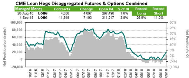 Vendredi, le rapport des positions en date du 4 septembre publié par le CFTC montrait que les spéculateurs augmentaient leur position acheteurs. Avec une position nette de 11 849 contrats, il s’agissait d’une augmentation (achat) de 7193 contrats sur la semaine. Le fait que la quantité de contrats ouverts augmentait également de 13 727 contrats durant la même période donnait de la force à la tendance haussière des prix. Cela pointe vers une hausse qui ne se limite plus à la couverture de position courte, mais réellement à l’apparition d’un sentiment fondamentalement plus positif sur le marché. Historiquement, les spéculateurs détiennent une position longue dans le porc et la situation semble maintenant retournée vers la normale après plusieurs semaines de pessimisme sur le marché.