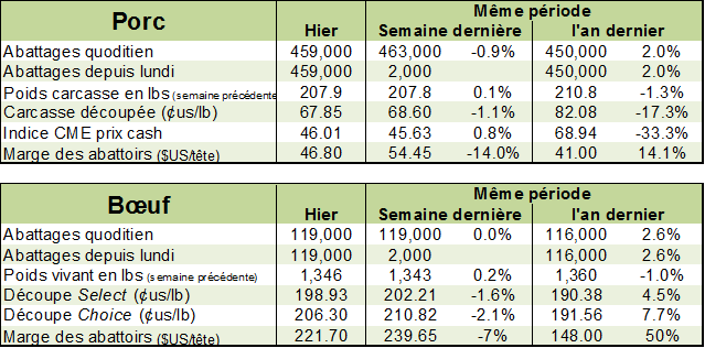 L’USDA estimait que les abattages étaient de 563 000 têtes la semaine dernière, en nette baisse de 75 000 têtes causée par la journée fériée de la fête du travail. Comparativement à l’an dernier où il manquait également une journée d’abattage, la variation était pratiquement nulle. Il s’agissait d’une baisse de 2 000 têtes ou -0.4% versus 2017. Depuis le début de l’année, la production est en hausse +3.0%.