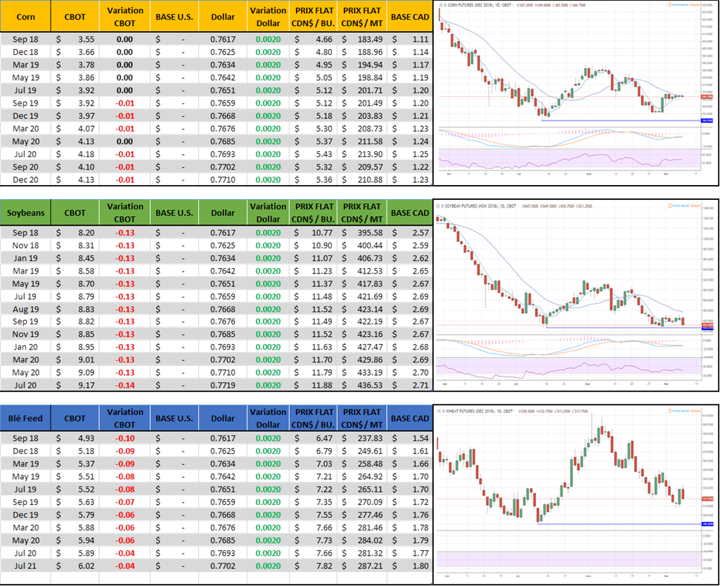 Les cours ont clôturé en légère baisse à 3.6675 récolte. Encore une fois aujourd’hui le volume a été faible, chose qu’on constate souvent à la fin de l’été à l’aube des récoltes. Les conditions des cultures ont été publié en retard et montre une hausse de la qualité alors qu’on aurait pensé le contraire. À ce point ci de l’année je doute que cela importe réellement les négociants. La récolte est commencée, 5% est battu et c’est un peu en avance. Aux USA comme ici, la maturité est plus avancé qu’à la normale donc possiblement peut-être que la récolte sera plus hâtive si la météo le permet. Les bases d’exportation dans le golfe continuent de progresser à la baisse avec la pression de la récolte; les bases de +50-60 cents à New Orléans sont rendues à 35-38 pour le spot et proche de 50 cents Oct/Nov/Dec. Les bases spots qui chutent proviennent fort possiblement des ventes des cultivateurs qui dégagent l’ancienne récolte avant de remplir le silo dans quelques semaines. Demain rapport USDA on s’attend à voir un rendement similaire au mois d’aout, et donc à moins de voir 180 BPA (178 le mois passé) les bas à 3.50 pourraient tenir le coup.