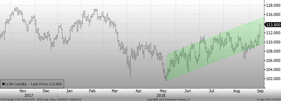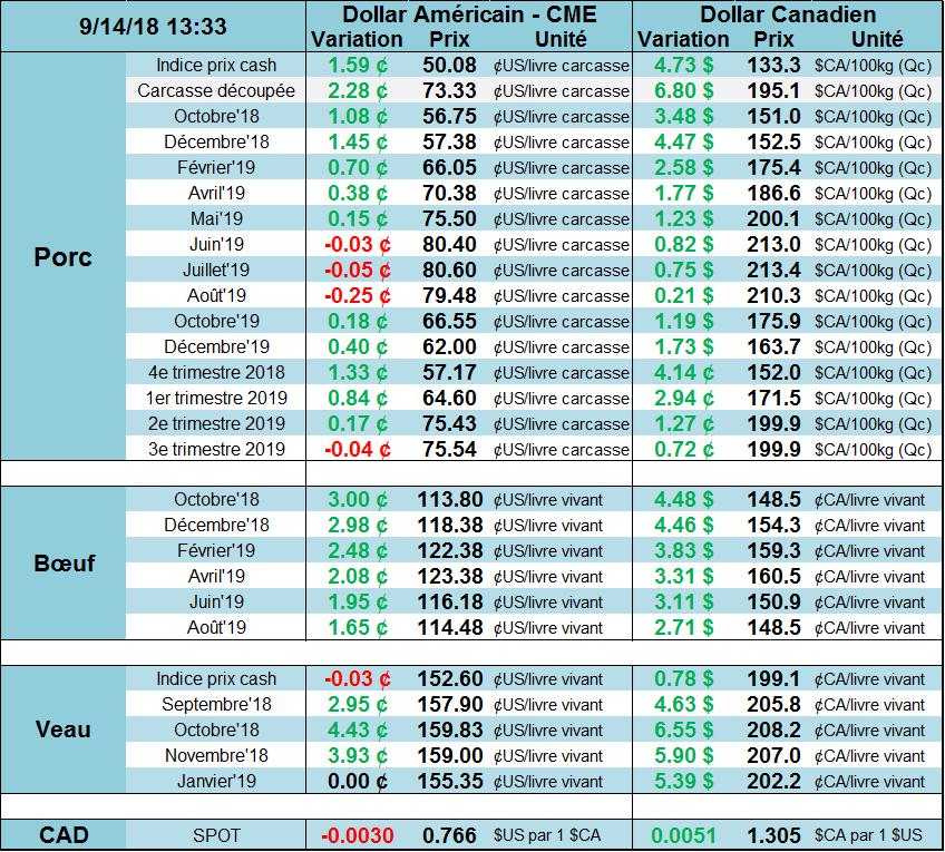 Le marché du bœuf explose aujourd’hui, atteignant de nouveaux sommets depuis le mois de mars malgré les prix à terme qui sont déjà bien au-dessus du prix des transactions. Cette semaine, quelques transactions ont été conclus à 107-108¢/lb alors que le bœuf d’octobre monte à 113.80¢/lb (limit up), démontrant l’optimisme du marché pour les prochaines semaines. Même s’il existe de bonnes nouvelles pour l’an prochain, telle que la possibilité d’une ouverture du marché chinois au bœuf américain, il n’en demeure pas moins que les échéances de cette année sont à risque d’une petite correction aux niveaux actuels. Le premium pour le contrat de décembre par rapport au cash est historiquement 2.50¢/lb, alors que le premium actuel est de 11.00-11.50¢/lb, ce qui invite à la prudence.