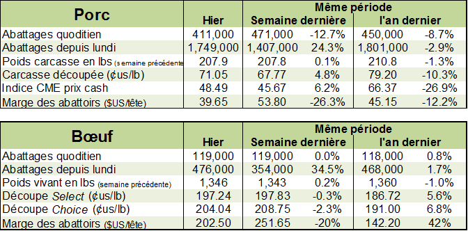 Selon l’USDA, les abattages étaient de 411 000 têtes hier ce qui amène le total pour la semaine à 1.749 million de têtes, en baisse de -80 000 têtes par rapport à l’an dernier. Il s’agissait d’une hausse de -4.4% versus 2017, principalement à cause des fermetures d’abattoirs de l’ouragan Florence.