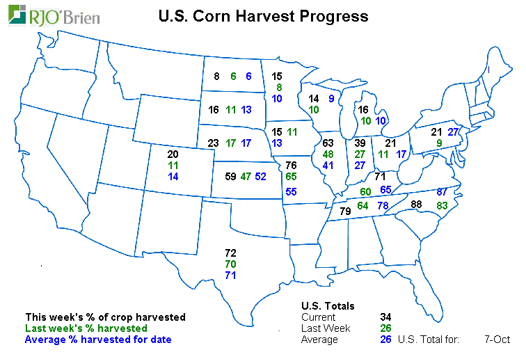 · Maïs récolté à 34%, 26% semaine dernière et 21% en moyenne